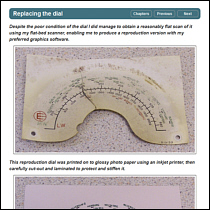 Despite the poor condition of the dial I did manage to obtain a reasonably flat scan of it using my flat-bed scanner, enabling me to produce a reproduction version with my preferred graphics software. This reproduction dial was printed on to glossy photo paper using an inkjet printer, then carefully cut-out and laminated to protect and stiffen it.