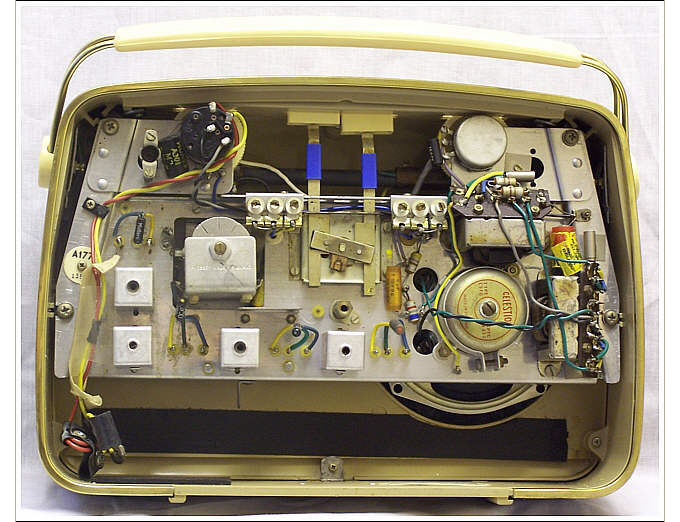Instead of battery valves this set uses seven Mullard OC-series transistors. Unlike the MB60 the set is battery powered only, using a 9 volt Ever Ready PP9 or equivalent.